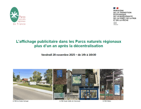 Webinaire du 28 nov 2025 de 14 à 16h30 "L'affichage publicitaire dans les Parcs naturels régionaux un an après la décentralisation"