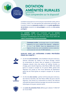 La dotation de soutien aux communes pour les aménités rurales, prévue à l’article L.2335-17 du code général des collectivités territoriales, vise à soutenir toutes les communes rurales dont une partie significative du territoire comprend une aire protégée ou jouxte une aire marine protégée.