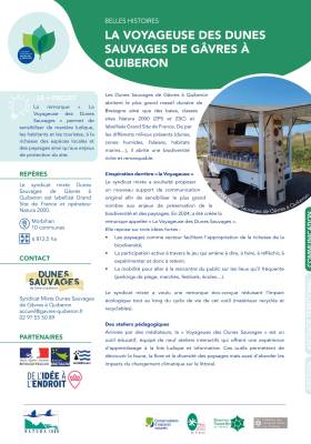 Le syndicat mixte a souhaité proposer un nouveau support de communication original afin de sensibiliser le plus grand nombre aux enjeux de préservation de la biodiversité et des paysages. En 2024, a été créée la remorque appelée « La Voyageuse des Dunes Sauvages ». Elle repose sur trois idées fortes :